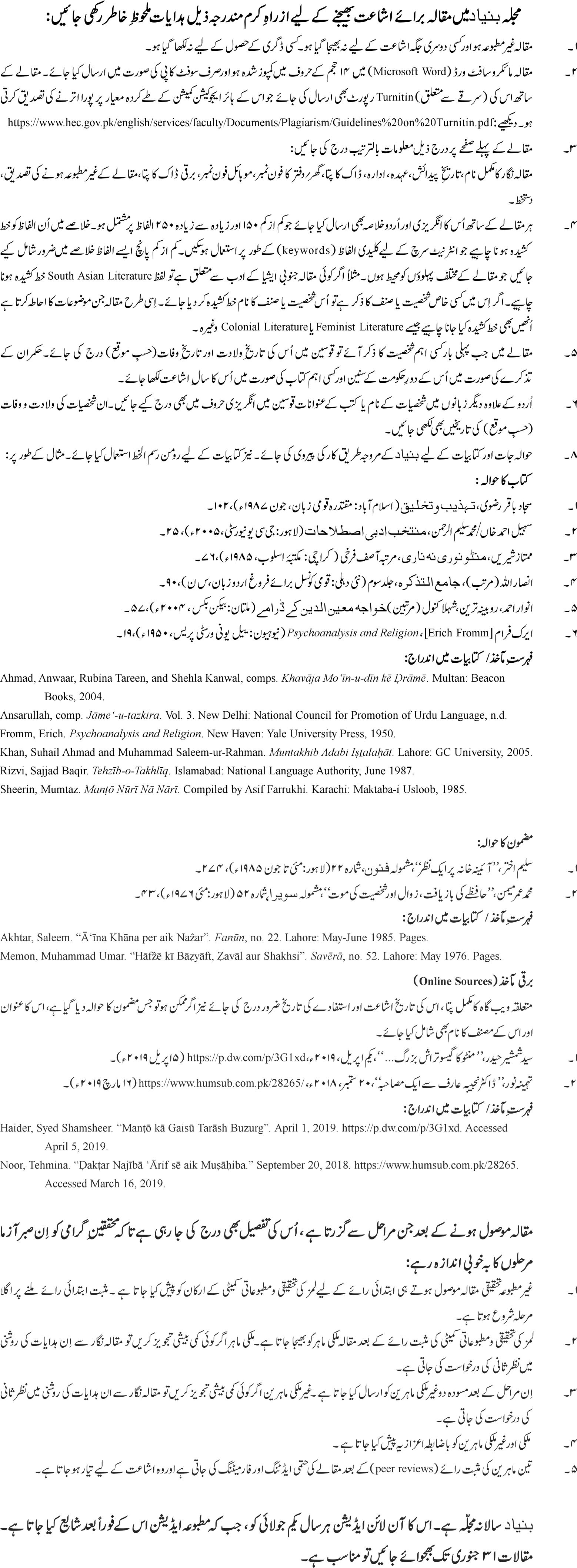 - 4. Each article must be accompanied by an abstract/synopsis (BOTH IN URDU AND ENGLISH) of not more than 200 and not less than 100 words. Please be sure to underline those words in the abstract which can be used as keywords for the article’s internet search. At least 5 such words must be underlined; for instance, if the article is about South Asian Literature, then these words must be present and underlined in the abstract. If a renowned personality or genre is being mentioned, the name must be underlined. Similarly, if the article falls under a certain category—Feminist Literature, or Colonial Literature— these, too, must be underlined.